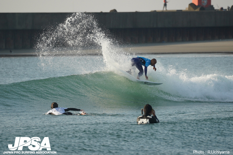 ヒート24にはグランドチャンピオン争いをしている安室丈がクレジット。安室は1本目に6.83をマークしてヒートをコントロール。2本目にも4.07を出してトップを走る。2位争いは大音凜太と池田鋭斗。池田はうまくポテンシャルのある波を選べず大音が3点台を2本出し有利に進める。結果、安室が1位、2位は大音でヒート終了。
