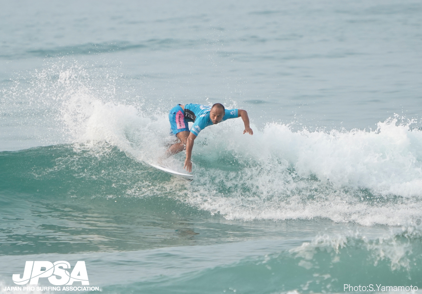 ヒート3は西修司、田中透生、小嶋海生と大橋海人の4名。波は力なくヨレ気味となり3点台がアベレージとなるところ、西が4.00を出して1位へ。序盤は大橋、田中、小嶋と続く。西はさらに4.93を出して突き放す。小嶋が3本目に4.40を出して2位へアップし、そのまま西と小嶋がラウンドアップ!