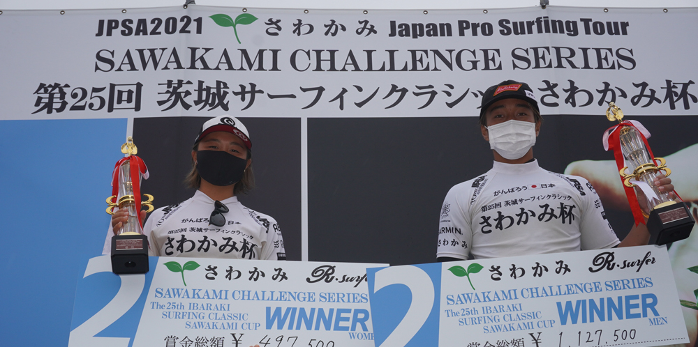 さわかみチャレンジシリーズ 第25回茨城サーフィンクラシック さわかみ杯 -Challenge II-は、茨城県大洗海岸で雨の中ファイナルが終了しメンズはJPSA初優勝になる安室丈、ウィメンズはトライアルから勝ち上がった松岡亜音が優勝した。